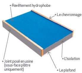 Panneaux rigides formés de 3 couches superposées, les panneaux sandwich constituent un seul élément autoportant (sous-face décorative, lame isolante et parement supérieur hydrofugé).